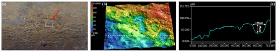 Taking samples on the inner wall of the tubing (Figure 12a), the corrosion products on the surface of the sample were cleaned with the de-filming solution. Then, a 3D confocal laser microscope (Keyence VK-X250K, USA) was used to analyze the pitting on the inner wall of the failed tubing. Figure 12b shows the 3D morphology of the inner wall of tubing after removing corrosion products. Lots of pitting is observed on the surface, and the pitting depth reaches 35 μm.