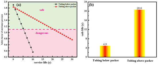 According to Equations (1)–(6), the remaining safety life and safety factor against the internal pressure of the tubing are predicted. Figure 13 describes the safety factor of anti-inner pressure and service life on tubing. As it shows, the safety factor of anti-inner pressure on tubing below the packer rapid decreases when the service life increases, while that of the tubing above the packer drops slowly (Figure 13a). The safe service life of the tubing above the packer is 20.6 years, while that of tubing below the packer is only 4.6 years (Figure 13b). Hence, a corrosion-resistant alloy is required for tubing below the packer.