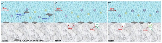 The free CO2 in formation water is in balance with that in CO32−, HCO3− ions. The pressure of the wellbore drops, which makes the free CO2 in the solution overflow when the formation water enters the wellbore from the formation. In order to maintain the equilibrium, Ca(HCO3)2 dissolved in water decomposes and produces CO2 to supplement free CO2 in solution [40]. However, the decomposition of Ca(HCO3)2 also produces CaCO3 at the same time. Moreover, the decrease in temperature results in the decrease in solubility of CaCO3 and BaSO4, leading CaCO3 and BaSO4 to continuously accumulate and adsorb to the inner wall.