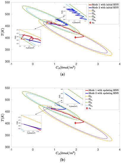 Closed–loop state trajectories for the uncertain CSTR system operating in mode 1 for h) (red solid line) and switching to mode 2 at h (blue solid line) under the RNN-LEMPC of Equation (26), (a) using the initial offline-learning RNNs at all times, and (b) using the online updating RNNs, for the initial condition = (1.95 kmol/m 402 K) (marked as red diamond).