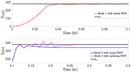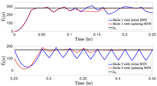 The simulation results for the nominal CSTR system switched between two steady-states under the RNN-LEMPC of Equation (26) are presented in Figure 5 and Figure 6. Specifically, the CSTR starts from an initial condition and operates in mode 1 for under the LEMPC with the initial RNN constructed with the dataset in . Subsequently, the CSTR operates under mode 2 for (i.e., the remaining operation time) following a switching schedule from mode 1 to mode 2 at under LEMPC using the initial RNN and the online updating RNNs. Figure 5 shows that under the initial RNN, the state trajectory closely follows the boundary of for mode 1. This is consistent with the result in Figure 6a, which shows that the Lyapunov function value under the initial RNN converges to after . It should be mentioned that the initial RNN is constructed with the dataset gathered from a portion of the operating region around , and, thus, the LEMPC with the initial RNN performs well for the CSTR operating in mode 1. Additionally, it is observed in Figure 5 that under the initial RNN, there exists a gap between the closed-loop state trajectory and the boundary of for mode 2, while the closed-loop state trajectory under the online updating RNNs ultimately operates near the boundary of after exhibiting oscillations for some sampling steps. It is more apparent in Figure 6b that the Lyapunov function value under the initial RNN converges to a value of 340, while it converges to after under the online updating RNNs. The total economic benefits within the operating period are calculated (note that the first update of RNNs occurs at ), which yields 4.75 and 4.84 for the LEMPC with the initial RNN and the online RNNs, respectively. Therefore, the accumulative economic benefits during are improved by via online learning. Finally, the RNNs are updated online at six times () to generate a sequence of hypotheses . Based on the testing error for each hypothesis , Equation (8) is solved with the hyperparameter to calculate the optimal weights for the hypotheses , respectively, yielding , , , , , and . Subsequently, the final RNN model h is developed with , and the CSTR operates in mode 2 under the LEMPC with this final RNN model for the remaining operation time. However, when there is a further mode transition for the CSTR, the online update of RNNs is required to perform again if the final model does not predict well for the CSTR operating in the new mode.