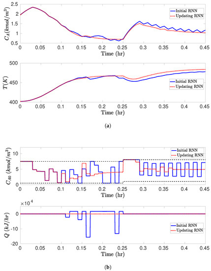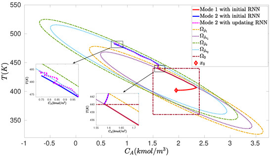 We next consider a special switching case of the nominal CSTR system, as discussed in Section 3.1, where the CSTR operates in mode 1 defined in Section 5.1 at all times (i.e., for Equation (32)) and does not involve disturbances. In this case, two steady-states = (1.95 kmol/m, 402 K) and = (1.22 kmol/m, 438 K) for the CSTR are considered under = (4 kmol/m, 0 kJ/h). The CSTR is switched between two steady-states at the prescribed switching times while maximizing the economic costs of Equation (33) under RNN-LEMPC. The CSTR is said to operate in mode 1 or 2 when it operates in the stability region or around the steady-state or . For both modes, the control Lyapunov functions follow those in Section 5.1 with . In this section, it is assumed that historical operational data is only available for the CSTR operating in a portion of operating region (denoted by ) around the steady-state , where (marked as a rectangle in Figure 5). Based on this limited training dataset, an initial RNN is trained using the same method in Section 5.1. The stability region and a subset for mode 1 follow those in Section 5.1 with and , and the stability region with and a subset with are chosen for the CSTR at mode 2 in this section. In this example, since the initial RNN is developed with the dataset in around the steady-state of mode 1, we will operate the CSTR in mode 1 under LEMPC with the initial RNN at all times. However, when the CSTR operates in mode 2, we will update the RNN models online since the initial RNN lacks the dataset around the steady-state of mode 2. Specifically, starting from the initial RNN, the RNNs are updated online using the most recent real-time data (i.e., every five sampling periods for each round) and the previous RNN model.