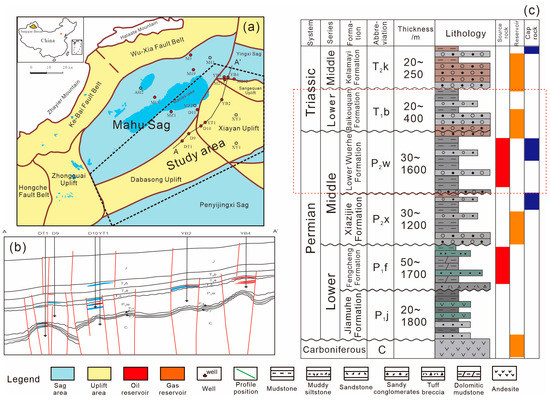 The Junggar Basin is located in the northern part of Xinjiang province. It is sandwiched between the Zaire Mountains, the Qinggelidi Mountains, the Kelameili Mountains and the Yilinhebiergen Mountains. It is slightly triangular and has an area of about 13.6 × 104 km2. It is a superimposed basin that has undergone multiple tectonic movements from Paleozoic to Quaternary. The study area is located in the northwestern margin of the Junggar Basin (Figure 1a), which is the most abundant area of oil–gas accumulation. The Carboniferous to Quaternary are well developed, and the maximum sedimentary thickness is nearly 15 km [11]. Permian and Triassic, Triassic and Jurassic, Jurassic and Cretaceous are regional unconformable contact relations (Figure 1b). The overlap and denudation of the Permian strata are obvious. Vertically, oil and gas reservoirs are distributed in 14 formations of 5 systems, i.e., Carboniferous, Permian, Triassic, Jurassic and Cretaceous [12]. The main objective strata of this study are Middle Permian Lower Wuerhe formation and Lower Triassic Baikouquan formation (Figure 1c).