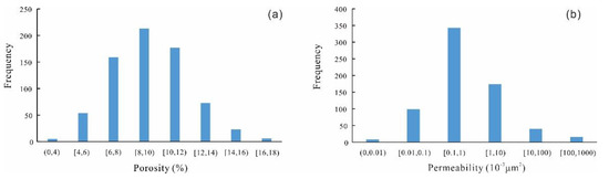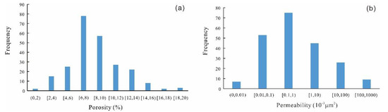 Distribution frequency histogram of porosity (a) and permeability (b) of Baikouquan formation.