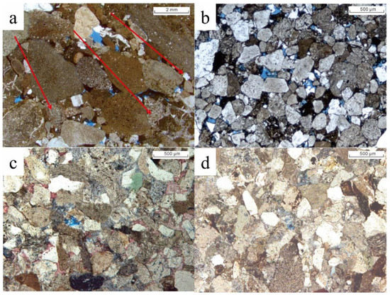 The compaction effect in the study area is obvious, which is the main pore reduction effect of the reservoir. Under the microscope, the contact relationship between the clastic particles is mainly point–line contact, and the concave–convex contact is locally developed. With the deepening of the sandy conglomerates burial, the compaction effect is enhanced so that the clastic particles are closely arranged in a certain direction (Figure 4a). The rigid particles (such as quartz and feldspar particles) are broken under pressure, and the feldspar is mostly broken along the cleavage crack. With the further strengthening of compaction, the contact mode of particles transits from point contact to line contact until the concave–convex contact (Figure 4b). Finally, the phenomenon of pressure solution appears with sutured contact, as shown in Figure 4c,d.