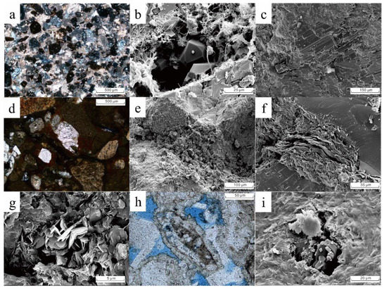 The burial depth of the Baikouquan formation and Lower Wuerhe formation in the study area is large, the overlying load compaction is strong and the cementation is common, resulting in a large volume loss of primary pores, especially in the superimposed structural compressive fault zone. As a result, the primary porosity of sandy conglomerates in the Lower Wuerhe formation is generally less than 10%, and that in the Baikouquan formation is less than 15% [18,19]. Therefore, dissolution and micro-fractures are important genetic mechanisms for the effectiveness of sandy conglomerates’ pore structure. Through the observation of cast thin sections, it is found that the dissolved materials in the study area are mainly debris, feldspar, calcite, laumontite, etc. The dissolution of debris particles usually has three characteristics: only part of the minerals in the particles have local dissolution, forming spotted, honeycomb and striped intragranular dissolution pores (Figure 6a,b); the particles are strongly dissolved, leaving only part of the residue or the entirety of it dissolved to form a mold pore (Figure 6c–e); and the edge of the particles dissolved irregularly or expanded to form intergranular enlarged dissolved pores (Figure 6f,g). In addition, intergranular interstitial materials and calcite, laumontite, sodium feldspar and other cements also exist dissolution. The laumontite dissolution pores is one of the important factors to improve reservoir physical properties in the Lower Wuerhe formation (Figure 6h,i).