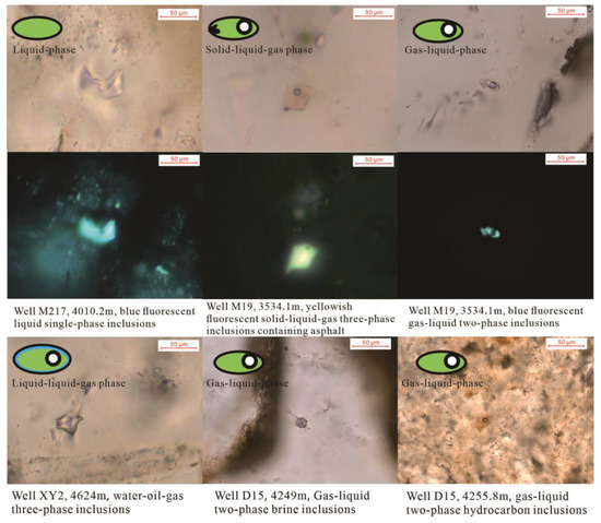 Microscopic photos of multi-stage hydrocarbon inclusions in reservoir.
