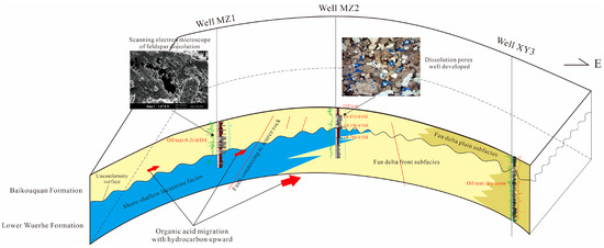 The above-mentioned studies indicate that the dissolution during diagenesis in the study area is closely related to the hydrocarbon charging process. It can be seen from Figure 12 that after the organic acid reaches the unconformity surface with hydrocarbon along the faults connecting to source rock, it will migrate to the high part of the structure, so the sandstone reservoir in the high part will first develop secondary pores. The concentration of organic acids in the high part is relatively higher and dissolution is more intense. As shown in Figure 12, there are faults connecting source rocks between wells MZ1 and MZ2. Organic acids migrate vertically with hydrocarbon through faults to the unconformity surface, and then migrate laterally along the unconformity surface (or sandstone) to the high part of the structure. Therefore, a large number of secondary pores dissolved by organic acids are developed in the reservoir of well MZ2, which is located in the high structural position. There is no fault connecting source rocks in the downdip direction of well MZ1, so there is almost no organic acid passing through. As a result, the reservoir is basically not dissolved and the physical properties is poor. In addition, the sedimentary subfacies of the Lower Wuerhe formation in well XY3 is in the fan delta plain, and the reservoir is very tight. So even if there is organic acid fluid passing through, dissolution is not easy because there is no chance for organic acids to contact with alkaline cements.