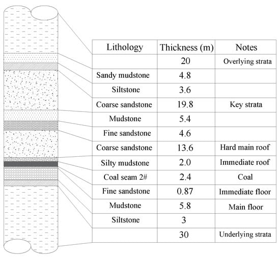 Dadougou coal mine adopted the NPM technology, the mineable coal seam is 2# with an average thickness of 2.4 m and a dip angle of 3°. The burial depth of coal seam 2# is approximately 480 m. The geological survey report indicated the immediate roof is silty mudstone with an average thickness of 2.0 m, the main roof is coarse sandstone with an average thickness of 13.6 m and the floor is mudstone and fine sandstone with an average thickness of 0.87 m and 5.8 m, respectively. The geological stratigraphy column of coal seam 2# is presented in Figure 2.