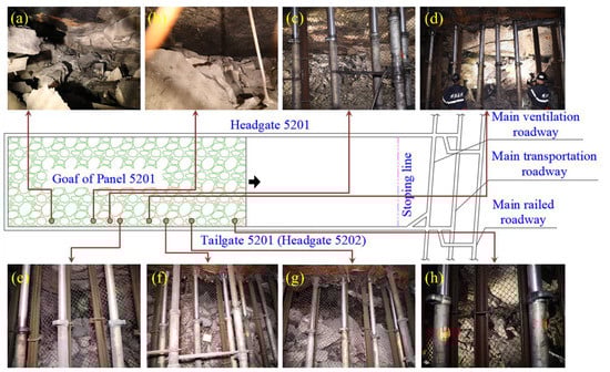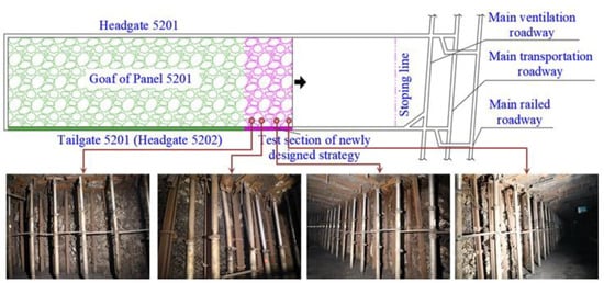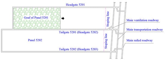 This study was conducted in tailgate 5201, with a length of 1726 m. The tailgate 5201 was used for transportation and was pedestrian in its primary used stage; after panel 5201 was mined out, the tailgate 5201 was retained as the headgate 5202 of panel 5202 for ventilation (Figure 3). The retained mode of tailgate 5201 is along the goaf-side by adopting the PRPBT. The height and width of the tailgate 5201 are 3.6 m and 5.2 m, respectively.