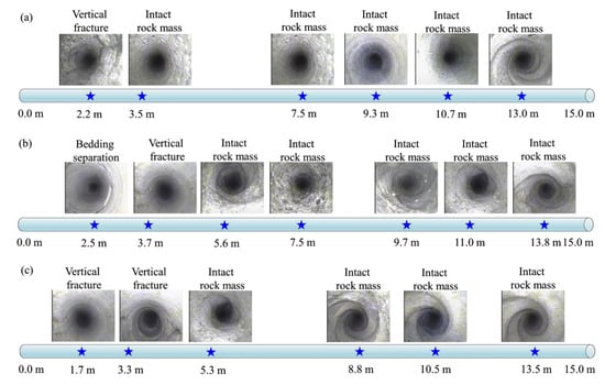 The boreholes were arranged before the retreating of panel 5201. Borehole 1# was arranged in the middle span of the roof and boreholes 2# and 3# were arranged 1.5 m away from the rib, respectively. The peeping results and their corresponding analysis are illustrated in Figure 4. Regarding borehole 1#, the vertical fracture developed at the depth of 2.2 m and the rock mass was intact at the depth of greater than 3.5 m. As for borehole 2#, the bedding separation developed at the depth of 2.5 m and the vertical fracture emerged at the depth of 3.7 m. However, the intact rock mass developed at the depth of greater than 3.7 m. As shown in Figure 4c, the vertical fractures developed at depths of 1.7 m and 3.3 m, respectively. The rock mass was integral at depths greater than 3.3 m. It is concluded that the vertical fracture and the bedding separation mainly developed in the shallow roof region within 3.7 m. When the depth was greater than 3.7 m, the rock mass was intact. Visually, the excavation of tailgate 5201 caused the breaking of the shallow roof region but had little impact on the deep roof. Because of the hard main roof, the rock mass was intact.
