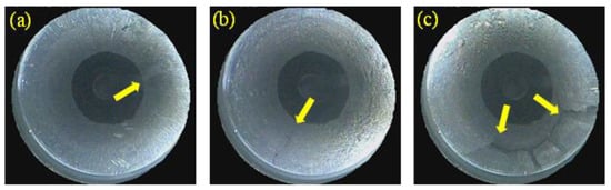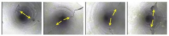 The roof cutting effect is closely related to the roof cutting parameters, for example, the roof cutting height, the roof cutting angle, the sealing length for blasting boreholes, the charge structure, the ignition mode and the ignition number of boreholes with each blasting []. A field investigation including in situ measurement and borehole peeping was conducted to explore the roof cutting effect. The boreholes’ peeping results indicated that the pre-splitting blasting effect was poor, as directional fissures were not developed and the rock mass in some regions was not cracked, as shown in Figure 5.