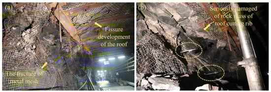 Actual scene of roof cutting rib damage: (a) potential roof collapse; (b) seriously damaged of rock mass near roof cutting rib.