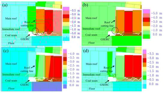 When the roof cutting height was 8 m, the immediate roof collapsed directly, but the immediate roof was not fully filled with the space between the main roof and the floor because the main roof was not completely cut off. The key blocks were hinged with each other, which then resulted in the state of a cantilever beam. Under the loading action of overlying strata and itself, the rotary movement of the main roof occurred, and then had a serious influence on the surrounding mass of the GSERC. Hence, vertical displacement ranging from 1.5 m to 2.0 m developed in the roof of the GSERC, as shown in Figure 8a. Compared with the roof cutting height of 8 m, vertical displacement ranging from 1.0 m to 2.0 m developed in the roof near the roof cutting side. When the roof cutting height was 9 m, the immediate roof also collapsed directly, but due to insufficient roof cutting action, the main roof had an adverse influence on GSERC. It can be obtained that the roof near the roof cutting rib had a serious subsidence. This situation is not conducive to GSERC maintenance.