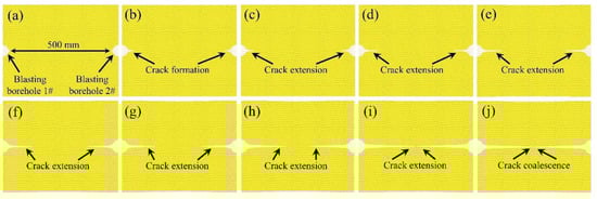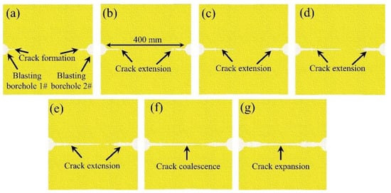 The crack development process under the spaced distance between two blasting boreholes with values of 400 mm, 500 mm and 600 mm was presented. The crack development process was divided into the crack formation stage, crack extension stage, crack coalescence stage and crack expansion stage. When the spaced distance between two blasting boreholes was 400 mm, with the propagation of explosive-induced gas, the crack continues to extend in the rock mass along the pre-splitting direction and the cracks of the two holes intersect each other to produce new cracks, which connect two blasting boreholes. The rock mass between two blasting boreholes can be penetrated; moreover, the crack can be expanded (Figure 9).