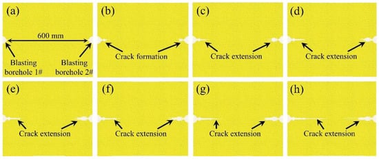 Crack development process with spaced distance of 600 mm: (a) 71 μs; (b) 82 μs; (c) 92 μs; (d) 101 μs; (e) 109 μs; (f) 116 μs; (g) 122 μs; (h) 127 μs.