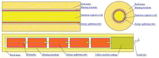 In the engineering practice of NPM, the core technology of the PRPBT is bidirectional energy concentrated pre-splitting blasting technology []. As a kind of pre-splitting blasting technology, this technology can realize the directional transmission of explosive energy along the direction of the shaped tube through the combination of the shaped charge tube and the explosive and then realize the directional fracture of rock mass along the roof cutting direction.