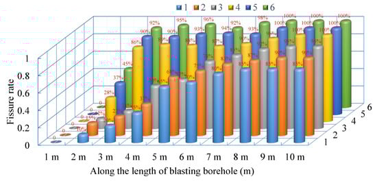 To further assess the pre-splitting blasting effect of different charge structures, the fissure rate was also obtained. As shown in Figure 13, the maximum value of the fissure rate for the charge structures of 3 + 3 + 3 + 2 + 1, 3 + 3 + 3 + 3 + 1 and 4 + 3 + 3 + 2 + 1 were 20%, 23% and 21% when the borehole length was less than 3.0 m, respectively. However, the maximum value of the charge structures of 4 + 3 + 3 + 3 + 1, 4 + 3 + 3 + 3 + 2 and 4 + 4 + 3 + 3 + 2 increased to 86%, 90% and 92%, respectively. The fissure rates of the charge structures of 4 + 3 + 3 + 3 + 1, 4 + 3 + 3 + 3 + 2 and 4 + 4 + 3 + 3 + 2 were greater than the charge structures of 3 + 3 + 3 + 2 + 1, 3 + 3 + 3 + 3 + 1 and 4 + 3 + 3 + 2 + 1. The results of the fissure rate were consistent with the peeping results. Hence, the charge structure was determined as 4 + 4 + 3 + 3 + 2.