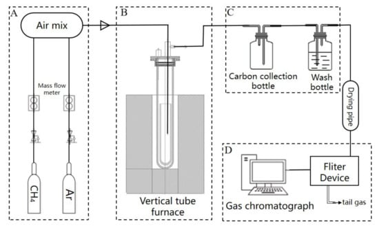 Diagram of the methane pyrolysis process: (A) air mix section; (B) reaction section; (C) carbon product collection section; and (D) reaction gas section.