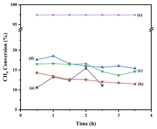 CH4 Conversion of catalysts: (a) NaCl-KCl; (b) 2 g Ni/NaCl-KCl; (c) 20 g Ni/NaCl-KCl; (d) 10 g Ni/NaCl-KCl; and (e) equilibrium conversion. (Conditions: 99.9% 100 sccm CH4; 900 °C; 20 ppi Ni foam; 150 g NaCl-KCl).
