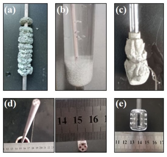 (a) Ni foam string; (b) quartz sand; (c) nickel mesh; (d) four-hole gas pipe; and (e) integrated disperser device.