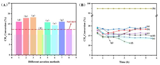 (A) CH4 conversion and (B) CH4 conversion under different aeration devices: (a) Ni (string)/NaCl-KCl; (b) Ni (fragment)/NaCl-KCl; (c) four-hole tube; (d) Ni/NaCl-KCl; (e) integrated disperse device; (f) quartz sand; (g) Ni mesh; and (h) equilibrium conversion. (Conditions: 99.9% 100 sccm CH4; 900 °C; 10 g Ni foam; 20 ppi Ni foam; 150 g NaCl-KCl).