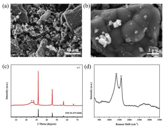 (a,b) SEM images of the carbon product; (c) X-ray diffraction pattern of the carbon product; and (d) Raman spectra of the carbon product.