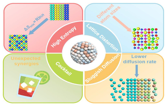 - Glasscott, M.W.; Pendergast, A.D.; Goines, S.; Bishop, A.R.; Hoang, A.T.; Renault, C.; Dick, J.E. Electrosynthesis of high-entropy metallic glass nanoparticles for designer, multi-functional electrocatalysis. Nat. Commun. 2019, 10, 2650. [Google Scholar] [CrossRef]