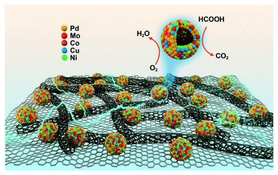 - Zuo, X.; Yan, R.; Zhao, L.; Long, Y.; Shi, L.; Cheng, Q.; Liu, D.; Hu, C. A hollow PdCuMoNiCo high-entropy alloy as an efficient bi-functional electrocatalyst for oxygen reduction and formic acid oxidation. J. Mater. Chem. A 2022, 10, 14857–14865. [Google Scholar] [CrossRef]