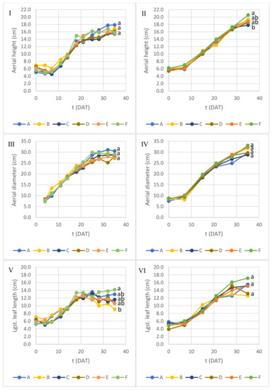 Lettuce growth parameters over time during (I,III,V,VII,IX) Experiment 1 and (II,IV,VI,VIII,X) Experiment 2. Different letters at 35 DAT indicate average values with significant difference (ANOVA with Tukey test; p < 0.05).