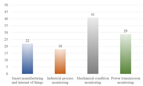More than 300 articles were retrieved via a precise search of subject matter such as titles, abstracts, and keywords while avoiding the substitution of synonyms. Considering the need for complete annual data indicators for statistical work, the time span chosen for this work was 2010–2021; journal categories: “Articles”, “Journals”, and ”Review Articles”. Relevant journals dealing with the field of engineering were used as refinement conditions for a secondary search of the papers. The number of articles retained after the secondary search was 224. This work was then filtered based on details such as abstracts to remove a subset of articles that were not relevant to the focus of the review. Some articles that were repeated in the three major citation databases were also filtered out. Ultimately, a total of 110 papers were selected for the review and analysis of RTFD [1,2,3,4,5,6,7,8,9,10,11,12,13,14,15,16,17,18,19,20,21,22,24,25,26,27,28,29,30,31,32,33,34,35,36,37,38,39,40,41,42,43,44,45,46,47,48,49,50,51,52,53,54,55,56,57,58,59,60,61,62,63,64,65,66,67,68,69,70,71,72,73,74,75,76,77,78,79,80,81,82,83,84,85,86,87,88,89,90,91,92,93,94,95,96,97,98,99,100,101,102,103,104,105,106,107,108,109,110,111]. In this section, 110 papers are initially counted and analyzed and divided according to application areas, among which 22 papers are related to “smart manufacturing and Internet of Things”, 18 papers are related to “industrial process monitoring”, 41 papers are related to “machinery condition monitoring”, and 29 papers are related to “power transmission monitoring”, as shown in Figure 1.