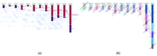 Evolution analysis graphs. (a) Country evolution analysis graph. (b) Keywords evolution analysis graph.
