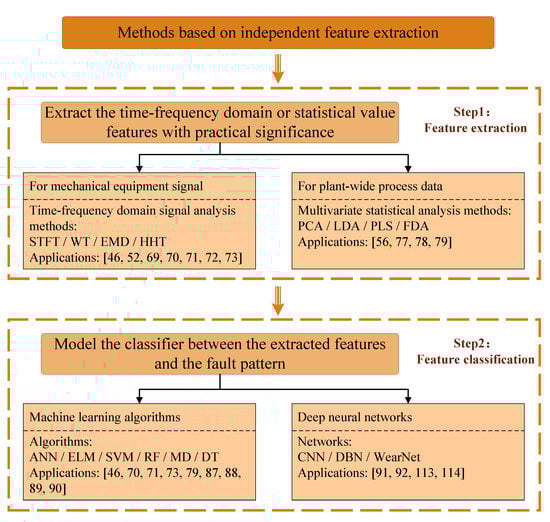 The idea of the methods based on independent feature extraction is to extract feature information of practical significance from the monitoring data and to establish the relationship between features and states for fault diagnosis through the classification of features. Extracting and classifying the characteristic information characterizing normal or faulty states, respectively, is the main step of the method. When there is a need to reduce noise or computational complexity, dimensionality reduction techniques such as PCA, LDA, and Relief can be used to compress features and eliminate redundant information [61]. The reduced-dimensional feature components help to build higher-performance models. Currently, the application of independent feature extraction-based methods in fault diagnosis is very widespread, especially for vibration and acoustic signals of mechanical equipment [62]. A detailed description of the two main steps in this method—feature extraction and feature classification—is given in Figure 5.
