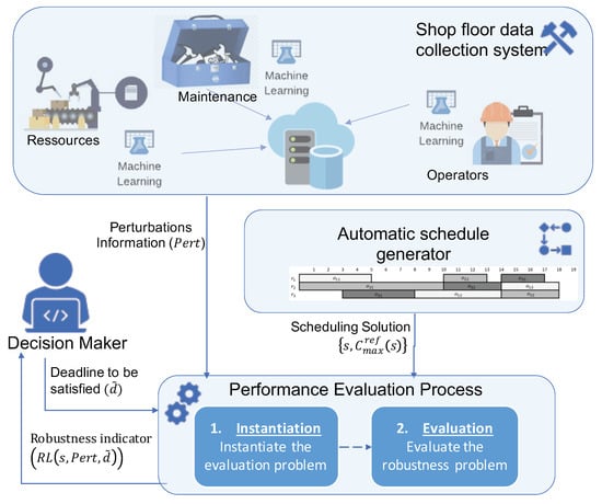 The main objective of the evaluation process is to help the decision maker to choose the adapted “robust” schedule that satisfies workshop constraints and a desired deadline despite considered uncertainties. In the context of Industry 4.0, the process (Figure 3) is considered as a decision making process allowing the using of available data collected and treated in the workshop, as defined by [1]. The process can either be integrated in a scheduler as an evaluation module or applied by the decision maker on existing schedules.