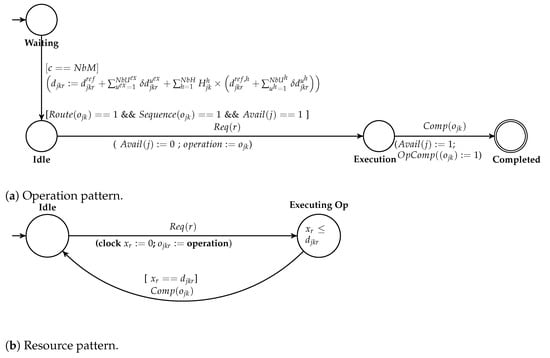 On one hand, the schedule is modeled using two patterns. The first one presents the behavior of an operation that needs to be executed, while the second one models the behavior of a resource (machine, operator, etc.). On the other hand, uncertainties are presented by two patterns, the first one models the behavior of uncertainty on parameters (UoP) and one the behavior of uncertainty on events (UoE).