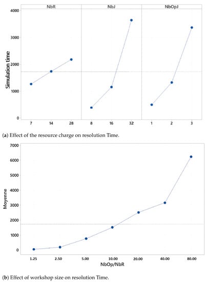 In order to understand the impact of the size of the workshop on the performances of the approach, we define a new parameter: the potential charge of the workshop. This is defined as the ratio between the number of operations to be executed in the workshop () and the number of available resources () (Figure 8a). The ratio impacts significantly the computation time.