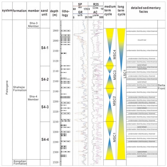 The identification and division of base level cycles are based on a combination of the characteristics of sedimentary facies and facies sequence changes []. The stratigraphic base level is not a completely fixed interface. In the process of change, it always shows a trend of unidirectional movement to the maximum or minimum amplitude of the base level, forming a complete base level rise and fall cycle. This rising and falling cycle of the base level is called the base level cycle []. The cyclicity of the sedimentation patterns within the Sha-4 Member is relatively apparent. The top interface of the Sha-4 Member is determined according to lithofacies and spontaneous potential characteristics data. Combined with the division of provenance direction and sedimentary facies, the Sha-4 Member is divided into one long-term cyclic sequence (LSC1) that can further be subdivided from top to bottom into four sand units: S4-1, S4-2, S4-3, and S4-4 (Figure 2). These four sand units correspond to four medium-term cycle sequences, which are MSC4, MSC3, MSC2, and MSC1, from top to bottom.