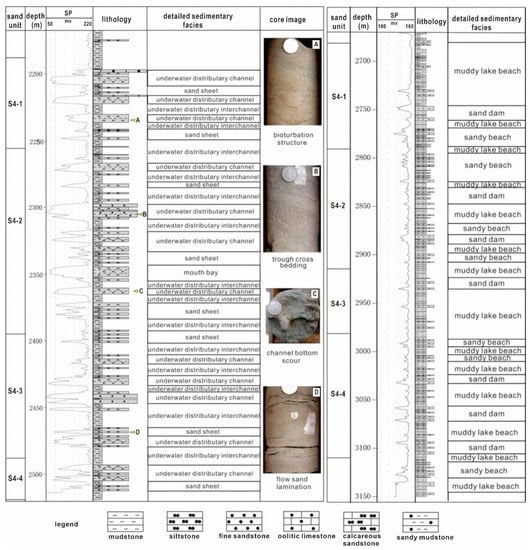 Delta front deposits of Well L57 (left) and shore shallow lake deposits of Well L202 (right). (A) bioturbation, 2235.03 m; (B) trough cross-bedding, 2305.42 m; (C) erosional scour, 2362.24 m; (D) flow sand lamination, 2468.08 m.