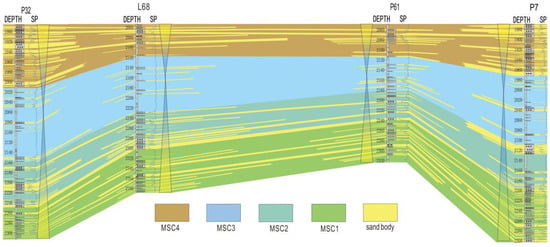In the east-west P32-P7 well correlation (cross-section) (Figure 6), the characteristics of sandbody development from MSC1 to MSC4 are similar to the north-south well correlation. Sandbodies developed during MSC1 decreased in size during MSC2. During the deposition of MSC3, the sandbody continuity was the lowest and the extension was generally the shortest. MSC4’s thick sandbodies were primarily formed in the west, while the thinner sandbodies can be found in the east, with good continuity and extensive sandbody extension.