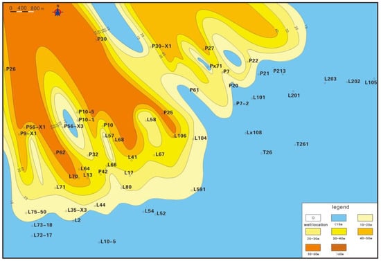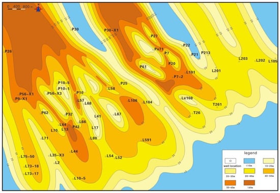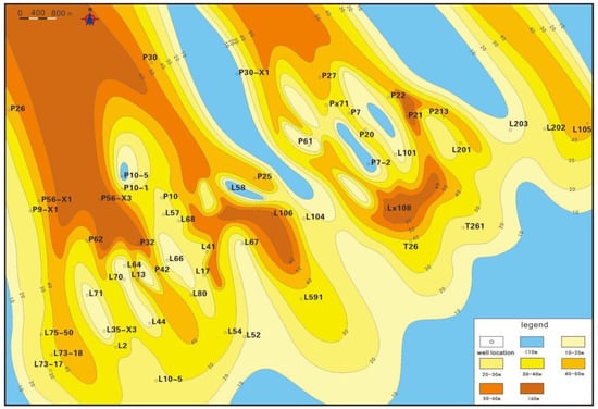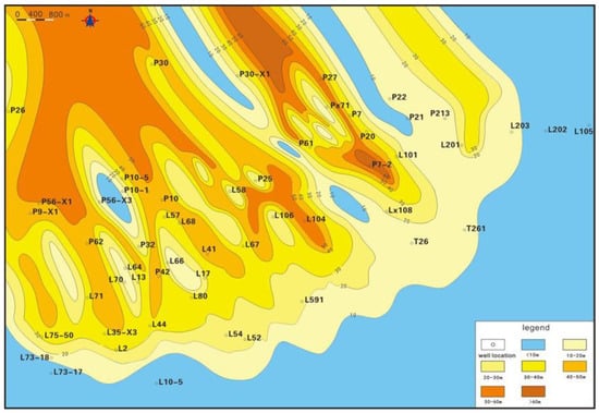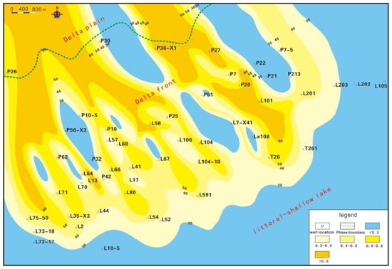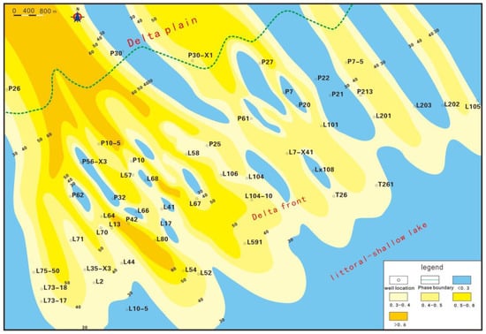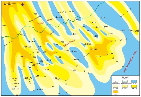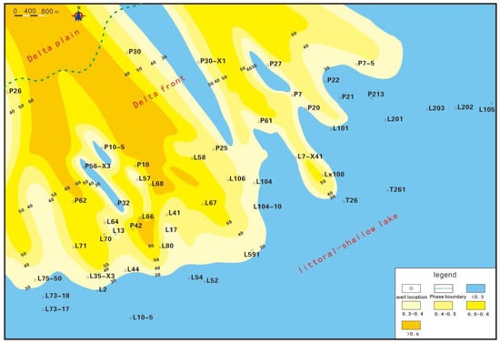The purpose of this contribution is to provide a sandstone thickness isopach map of each sub-member in the study area based on the statistics of sandstone thickness data for each sub-member in the Sha-4 Member of 54 wells, combined with stratigraphic characteristics data. As the provenance is in the northwest of the depression [], the sandstone thickness gradually decreases from the northwest to the southeast. Additionally, a plane distribution map of the sedimentary facies of the Sha-4 Member is provided. Within this article, the term “sand ratio” refers to the ratio of the total thickness of sandstone to the formation thickness. The direction of the sand ratio indicates the direction of the material source. The analysis of sedimentary facies through the sand-land ratio isopach map is one of the important research methods of sedimentology. We divided the study area into three sections: shore shallow lakes with a sand-land ratio of less than 0.3; delta front with a sand-land ratio greater than 0.3 but less than 0.6; and delta plain with a sand-land ratio greater than 0.6.