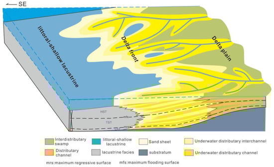 According to the facies map (Figure 11), the MSC1 deposition is mainly characterized by retrogradation, and the sedimentary facies are primarily related to underwater distributary channels. The delta area was relatively small during the initial stage of deposition, while the lake area was relatively large. The delta front area in the study area was beginning to shrink at the time of MSC2 deposition, as was the delta plain facies belt (Figure 12). As a result, the river channel narrowed, and the lake grew rapidly. During the sedimentation period of MSC3, the delta facies first narrowed and then extended to the southeast lake (Figure 13). The delta area grew larger over time, and the range of shore-shallow lake facies shrank. During the MSC4 period, the delta facies began to expand, while the shore-shallow lake facies belt shrank further (Figure 14). The delta front occupied the majority of the study area, and the delta plain facies belt gradually migrated eastward. Simultaneously, the hydrodynamic conditions became stronger, resulting in the continuous interaction and superposition of sandbodies in the delta front.