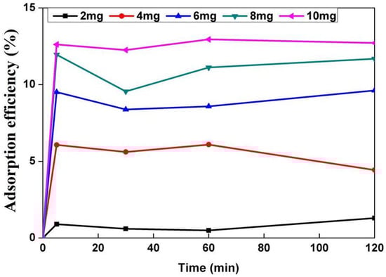 The initial concentration of Sr2+ was 100 mg·L−1, and the amount of soil colloids were 2, 4, 6, 8, and 10 mg, respectively; these quantities were used to calculate the adsorption efficiency. As is shown in Figure 1, with the increase in the solid-to-liquid ratio, the adsorption capacity gradually increased. In the first five minutes of the reaction, the adsorption efficiency increased rapidly, the maximum adsorption efficiency increased from 0% to 13%, which may be attributed to more available adsorption sites at the beginning of the reaction. After half an hour, the adsorption reaction basically was kept in an equilibrium.