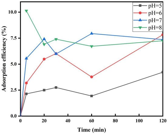 As shown in Figure 2, the adsorption efficiency was approximately 2% at pH = 5, and it increased to 7% with an increase in the pH to 7. At a pH of 3–10, Sr was present in the form of Sr2+; therefore, the adsorption behavior was dependent on the negative charge on the soil colloid surface []. With the increase of the pH value, the dissociation of negative minerals on the clay minerals, organic matter, and oxide surface in the soil colloid was promoted, thereby increasing the number of negative charges on the colloidal surface []. Therefore, the subsequent experimental pH = 6 value was selected.