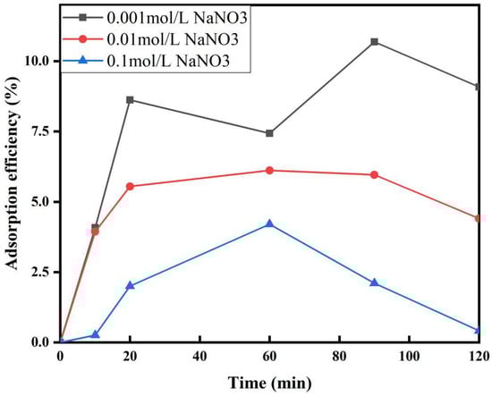 The effect of ionic strength on the sorption process is shown in Figure 3. It was clearly found that the ionic strength has a significant inhibiting effect on the adsorption. As the ionic strength increased from 0.001 mol·L−1 to 0.1 mol·L−1, the adsorption efficiency decreased from 10% to 3%. One reason for this may be that the ionic strength affected the electrostatic interaction of the colloidal surface. A high ionic strength would weaken the repulsive force, causing agglomeration, which decreases the number of available adsorption sites. On the other hand, the presence of electrolytes on the adsorption, mainly due to the cationic ions and Sr2+ produce competitive adsorption sites for the adsorption on the colloidal surface [,]. The results obtained were similar to the sorption of Sr2+ on a magnetic adsorbent and on montmorillonite [,]. It was also reported that the adsorptions of the Sr2+ and U6+ on the Na-rectorite decreased with an increase in ionic strength [].