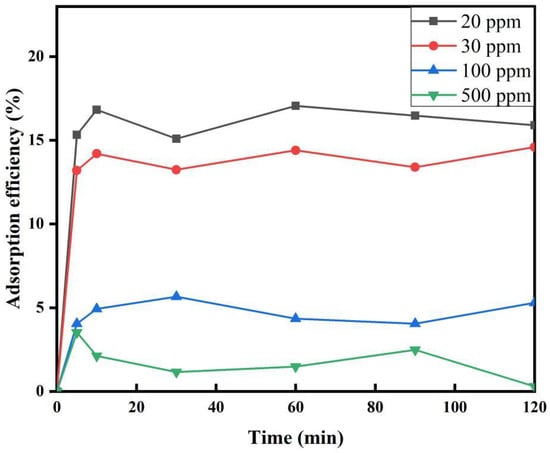 As shown in Figure 4, the adsorption efficiency increased from 2% to 17% with the increase in the initial concentration of Sr2+. When the interaction between the colloids and the strontium equilibrated, the adsorption efficiency slowed down, and as the initial concentration increased, the residual unreacted strontium ion concentration increased, and the adsorption efficiency decreased.