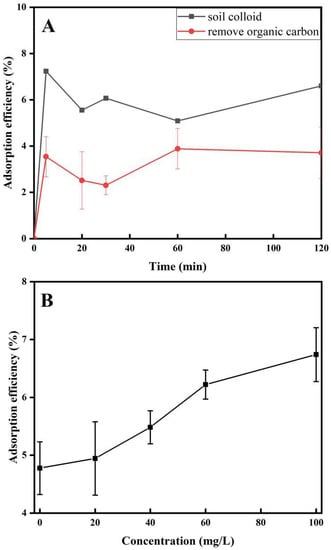 The effect of organic matter on the adsorption of Sr2+ from soil colloids was studied by using H2O2 to remove the organic matter in the soil colloids [,]. A certain amount of H2O2 was added into the soil colloids, and the soil was put in a heated water bath to evaporate until no bubbles were present. Finally, the supernatant was discarded by means of centrifugation. The matter at the bottom of centrifuge tube was the inorganic soil colloids.
