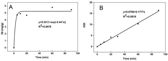 To examine the controlling mechanism of the adsorption process, the pseudo-first order kinetic and pseudo-second order kinetic models were employed to examine the experimental data at an initial concentration of 100 mg·L−1 at pH 6, 25 °C, and the soil-liquid rate of 0.80 g·L−1 according to Equations (2) and (3) [,]: