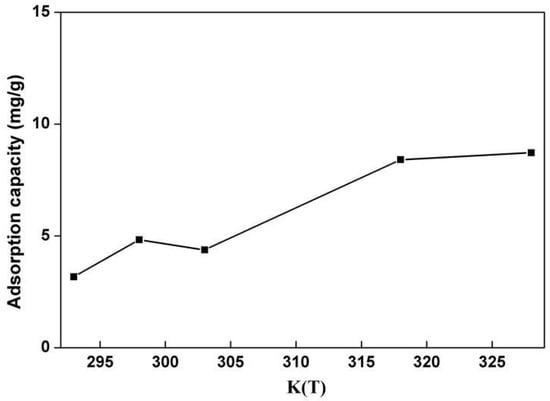 As shown in Figure 7, the adsorption quantity gradually increased with the increasing of temperature. The data were fit to the thermodynamic model. Thermodynamic parameters are listed in Table 4, include the Gibbs energy (ΔG), enthalpy (ΔH), and entropy (ΔS) were calculated from the following equations [,]:
