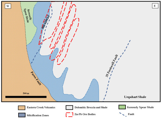 Geological sections showing the distribution of silica-dolomite, Zn-Pb mineralization. Based on the geology of the Mount Isa deposit, silica alteration’s geometry is presented as well as its relation to bedding and faults (is a schematic representation, after [44]).