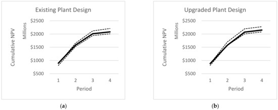P10, P50, and P90 curves cumulative NPV of the existing (a) and upgraded (b) designs.